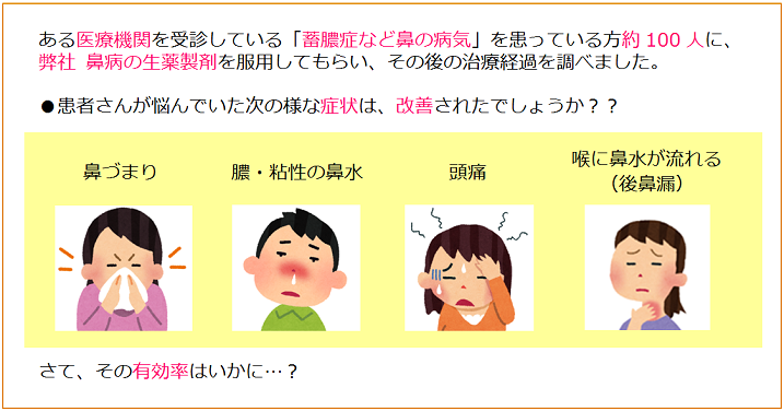 弊社では、鼻づまり等を治す効果が生薬のお薬に期待できるか調べるため、弊社の鼻病生薬製剤を医療機関で医師に使ってもらい、『臨床試験データ』も取っています。
