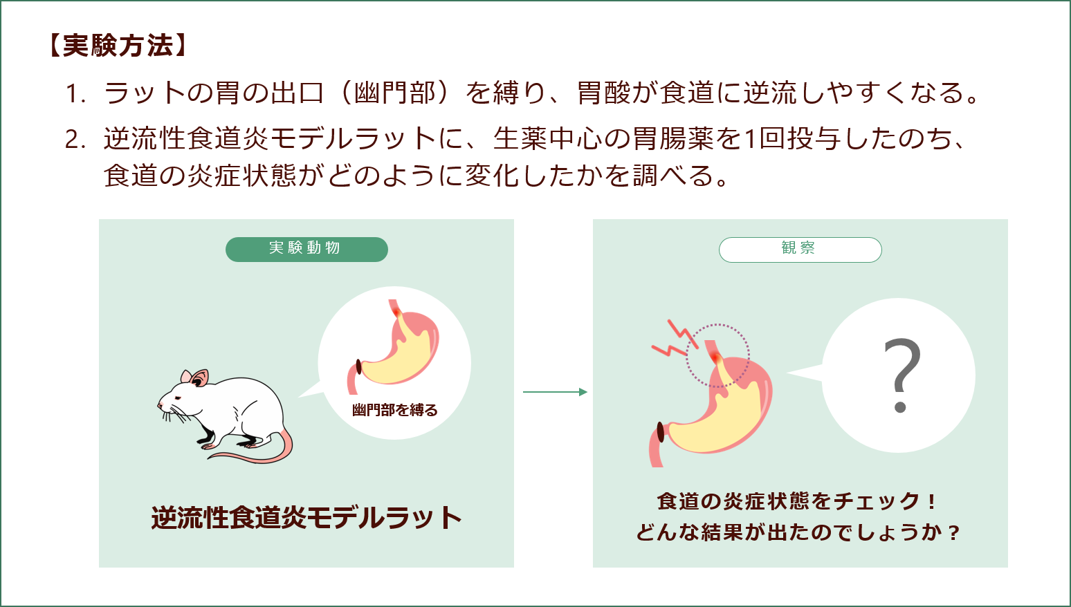 弊社では、胃腸の働きを整える生薬中心のお薬が、近年増える胃の不調「逆流性食道炎(胃酸の逆流によって生じる食道の炎症)」を抑える効果があるか、次の試験を行って確かめています。