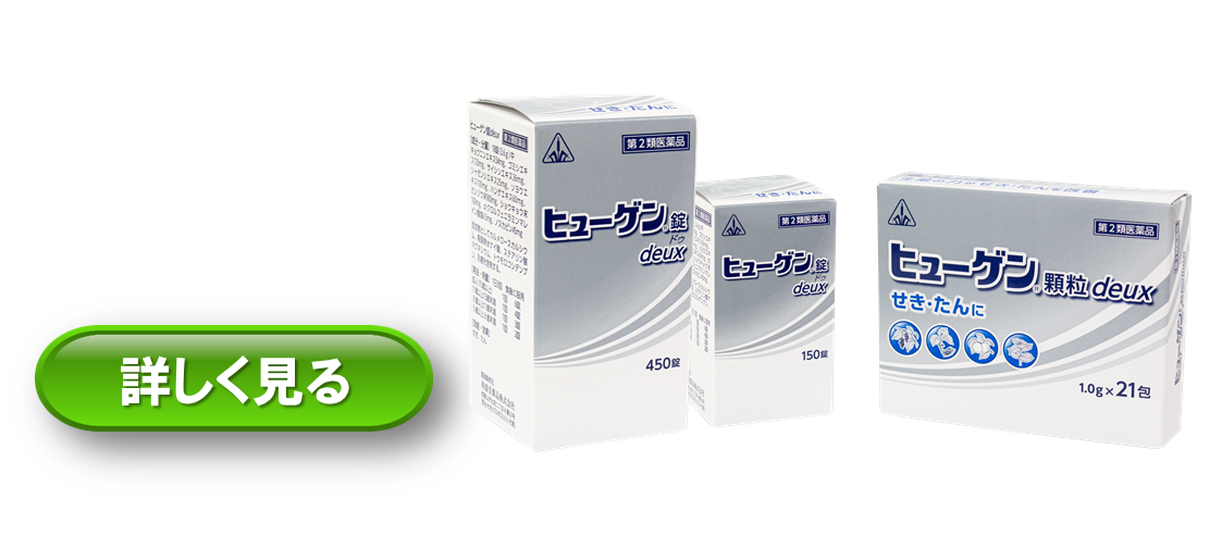 ホノミ漢方の咳・痰に効く「ヒューゲン錠・顆粒deux(第2類医薬品)は、濫用成分・依存性のある成分を含まないため、長引く咳にもオススメです。