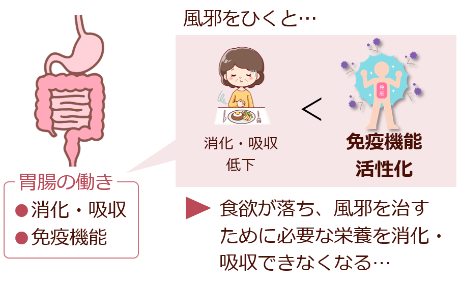 胃腸には免疫力を活性化させる役割もあり、風邪をひいた時、食べ物の消化・吸収よりも免疫の働きを優先するため、食欲が落ちてしまいます。