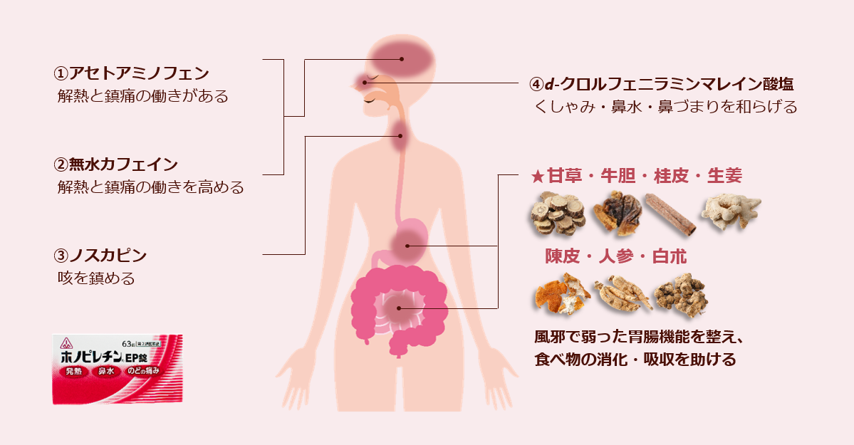このように、ホノピレチンEP錠は、生薬と西洋薬両方の働きを活かして、風邪の症状の改善を図ります。