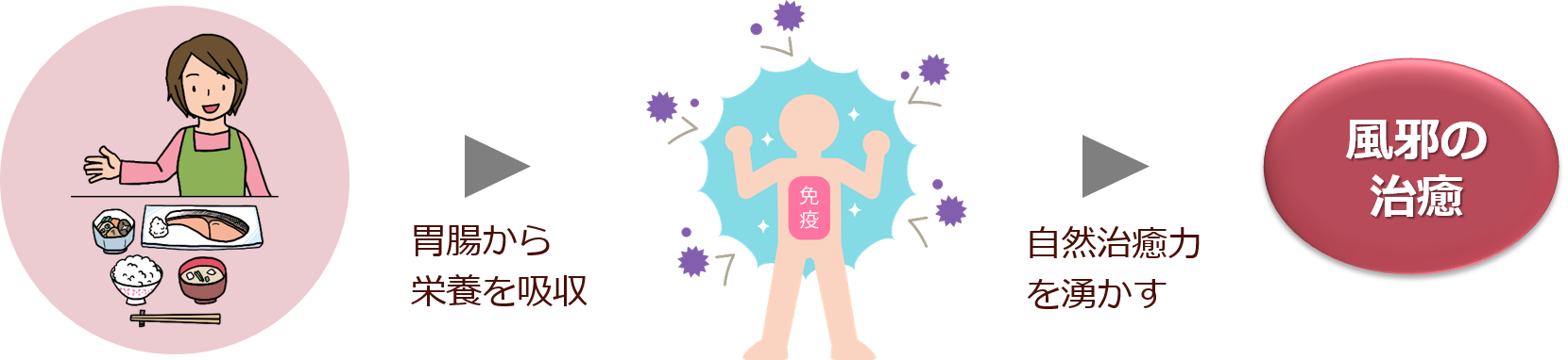 風邪を早く改善させるポイント、それは症状を鎮めるだけでなく、胃腸機能を整え、自然治癒力を湧かしやすくする対策も同時に行うことにあります。