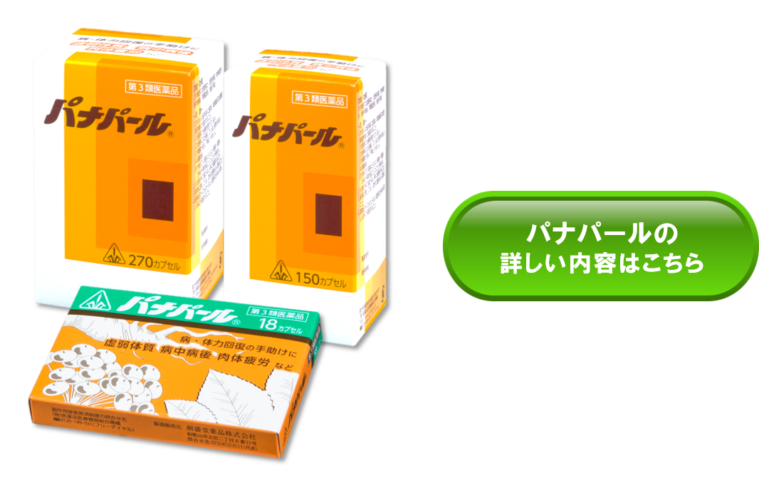 「パナパール」(カプセルタイプ)「パナパール錠」(錠剤タイプ)は、病気を治すときに必要な身体の自然治癒力を高めることで、全身に力をつけつつ、病気の治りを早めてくれるオリジナルの生薬製剤です。